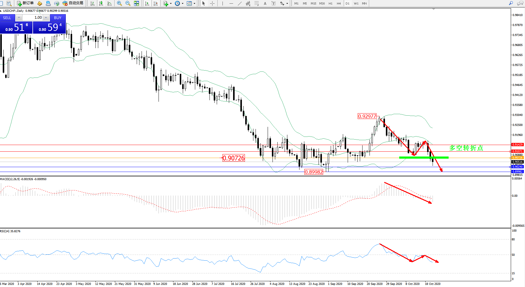 交易策略:0.90726下方看跌,目标0.90240、0.89982