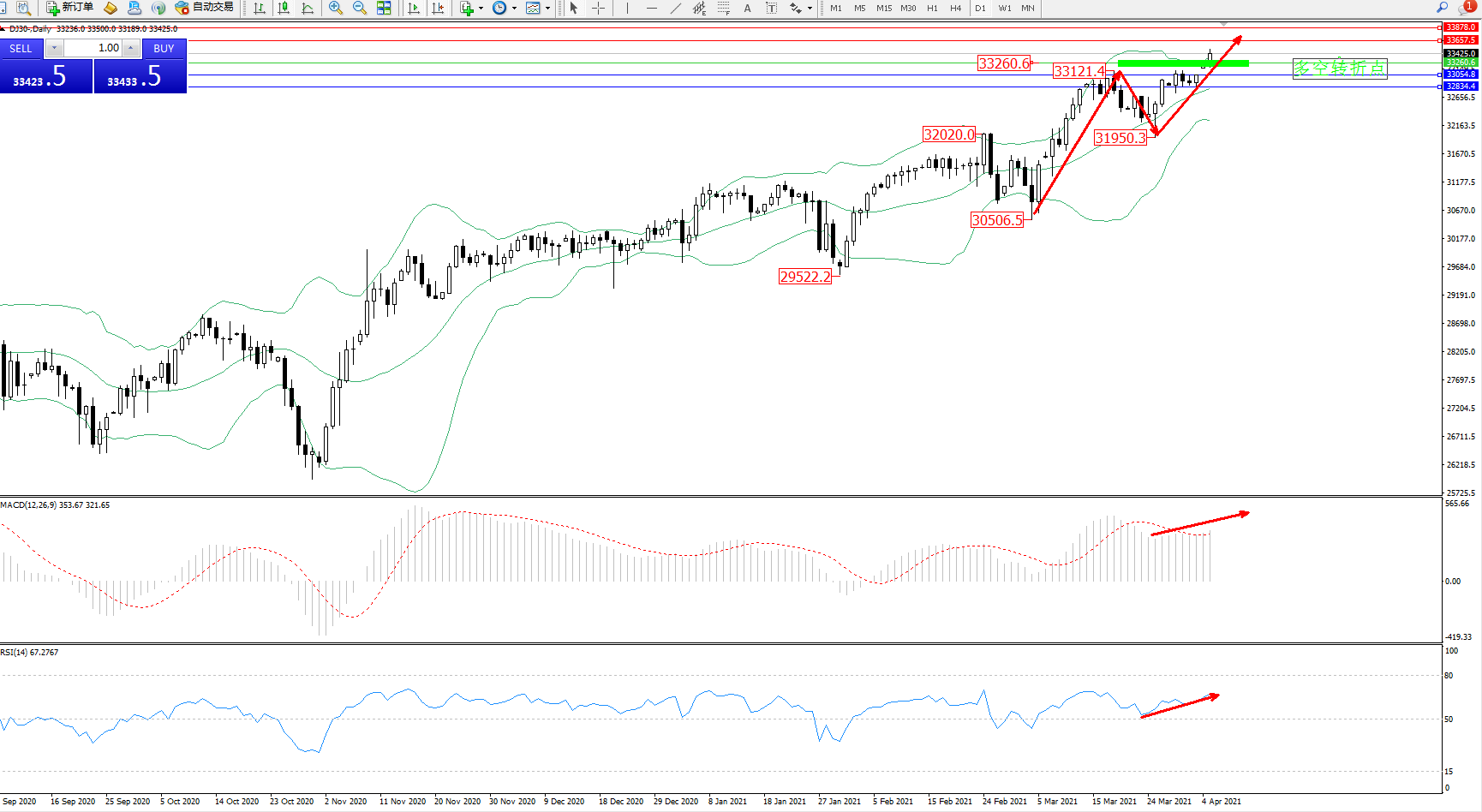 交易策略:33260上方看涨,目标33657、33878