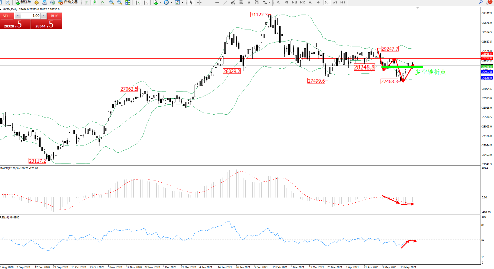技术点评:空头动力延续布林带指标通道中下轨区间呈阶梯式震荡下行,低位抵达27468位置后得到短暂支撑反转上移,多头动力处于中轨附近弱势窄幅震荡中,布林带指标呈张口走势后开始缓慢收口,MACD指标处于0轴线下方空头区域弱势整理徘徊,RSI指标处于空头区域维持窄幅整理回升50均衡线下方;