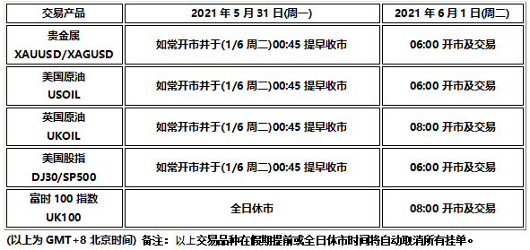 因应2021年5月31日(周一)为美国阵亡将士纪念日(Memorial Day)及英国市场春季银行假期(Spring Banking Holiday),以下产品的交易时间将于假期期间提早或全日休市,敬请阁下知悉留意!
