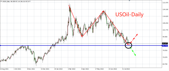 美油维持自6月以来的下降趋势,下方即将触及85美元的中期支撑,考虑到近期油市各大事件频发,关键节点临近,该位为多空分水岭。一旦油价能有效企稳85美元,后市有望反弹并重返100美元,若下破85美元则空头加强,下方续看80-76美元。