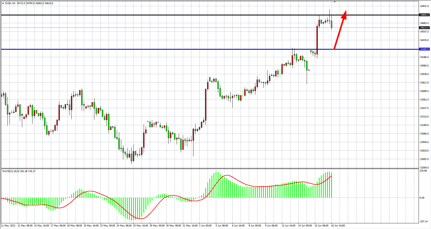 4小时图看,道指在34800一线遇阻,短期压力明显,MACD量能维持在零轴上放量,行情走强格局不变,下方支撑34450-34300,上方看34800-35000。